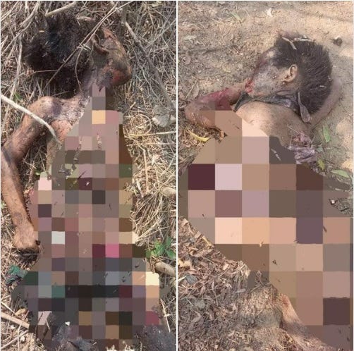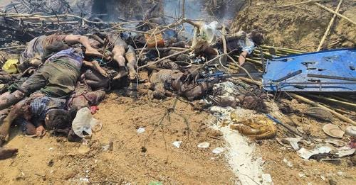 On April 11 the regime committed its biggest civilian massacre yet, in Paziji village in the war-ravaged Kantbalu Township of Sagaing Division. A crowd of residents gathered at 8:00 a.m. for a morning dedication ceremony for a new People’s Authority, or local liberation governance body. A dalan must have informed the junta, because a jet and an Mi-35 helicopter showed up at the precise time and place of the dedication and dropped bombs and strafed the location. At last report 170 people were killed including 21 children, though the precise number was difficult to determine due to the condition of the corpses, or the obliteration of some of them.